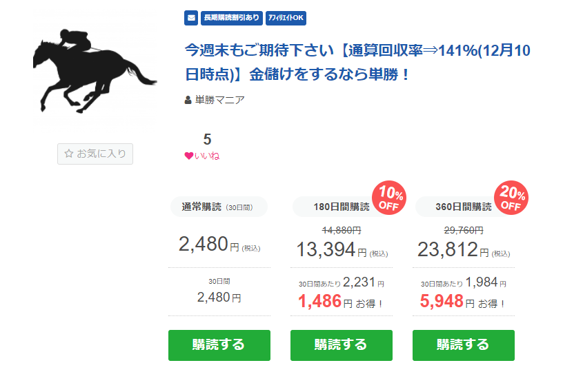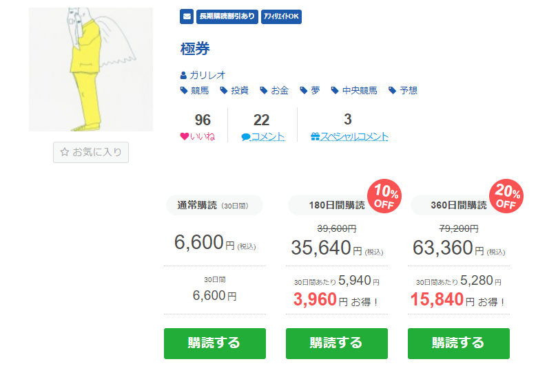 月額メルマガや予想記事の販売などユーザーの用途に合わせた購読が可能