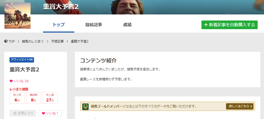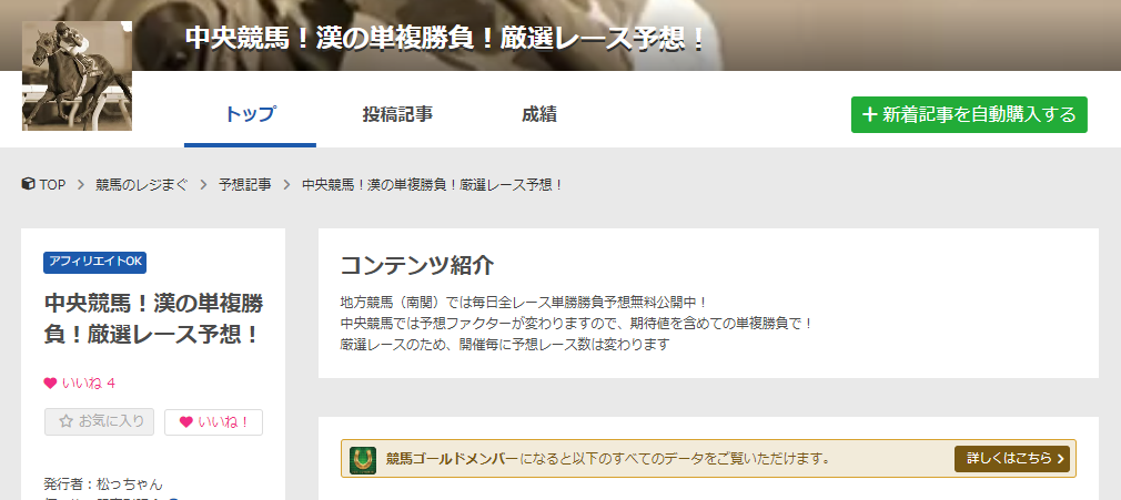 レジまぐ内の有料予想には、月額メルマガやブログ、予想記事の個別販売などユーザーの用途に合わせてそれぞれの商材が販売されています。「競馬は重賞しか楽しまない」「がっつり予想を参考にしたい」など各読者の用途に合わせて購読内容を選択できます。