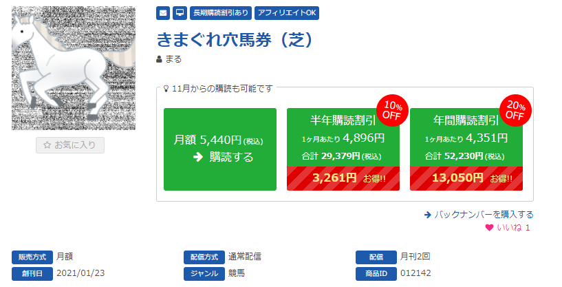 有料予想の穴馬特捜班noteは月内の中央競馬の予想が全て閲覧できる月初めの購読がおススメです。都度課金よりもお得な月額マガジンをこの機会に是非ご購読ください。