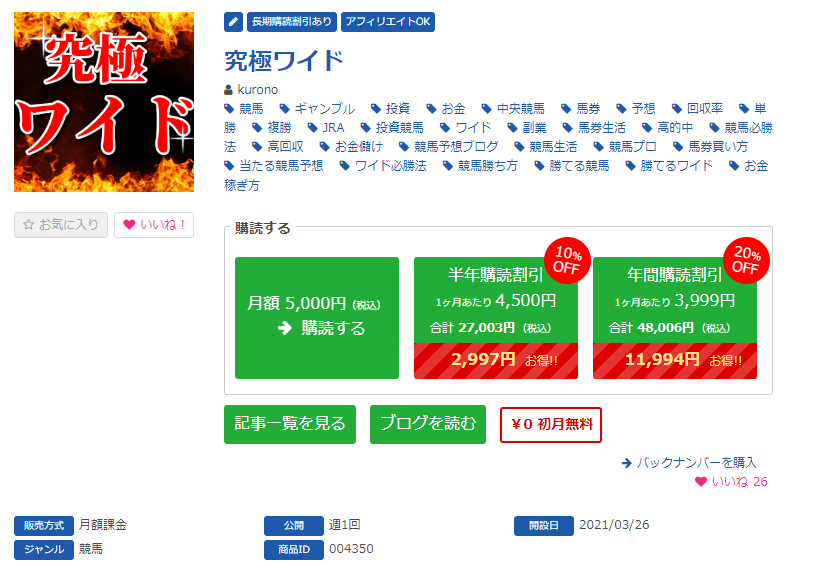 有料予想の穴馬特捜班noteは月内の中央競馬の予想が全て閲覧できる月初めの購読がおススメです。都度課金よりもお得な月額マガジンをこの機会に是非ご購読ください。