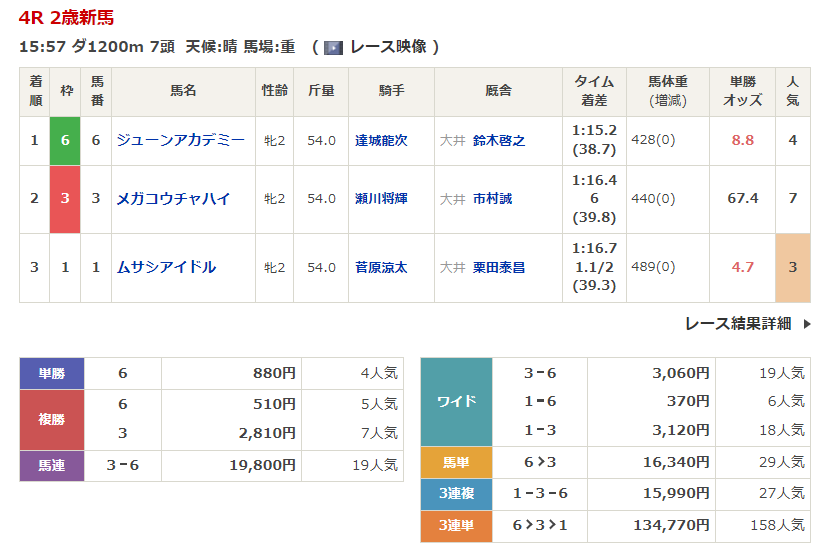 ◎ラグーンリバティ(6人気)1着 単勝7,970円、複勝540円