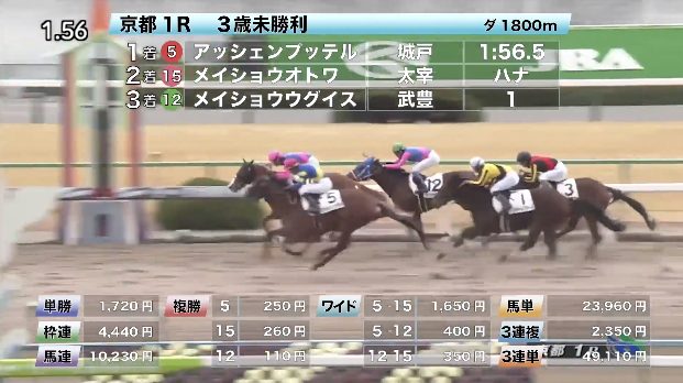 ◎アッシェンプッテル(6人気)1着 単勝1,720円、複勝250円 - 1/12【京都4R】3歳新馬