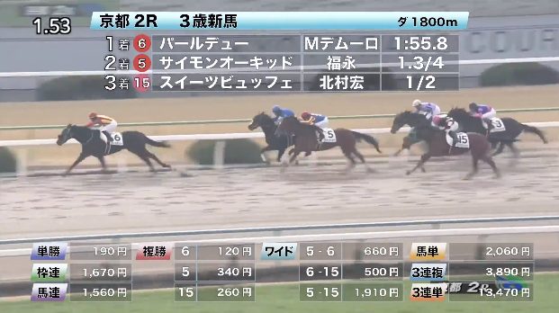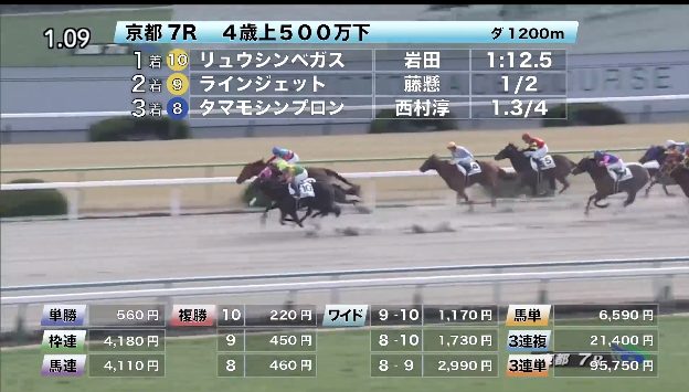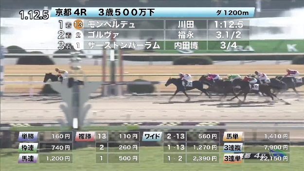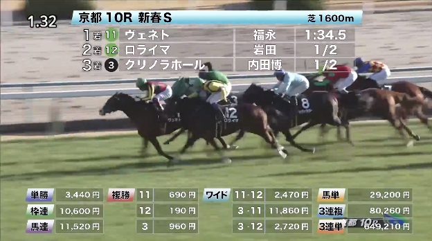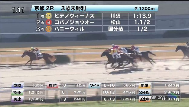 ◎シセイヒテン(4人気)1着 単勝660円、複勝190円 - 1/12【京都1R】3歳未勝利