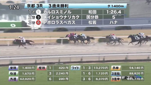 ◎カルロスミノル(6人気)1着 単勝1,400円、複勝420円 - 1/13【京都4R】500万下