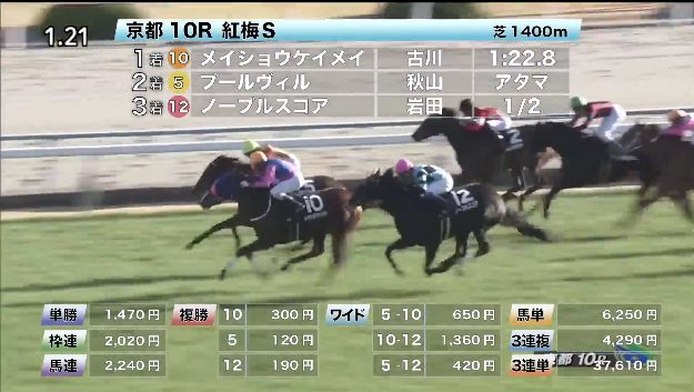 ◎メイショウケイメイ(5人気)1着 単勝1,470円、複勝300円 - 1/14【京都12R】1000万下