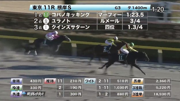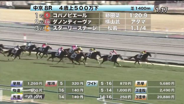 ◎コパノピエール(5人気)1着 単勝1,260円、複勝320円