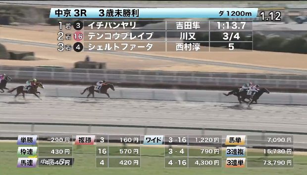 ◎カルリーノ(7人気)2着 複勝400円 - 1/6【中山12R】1000万下