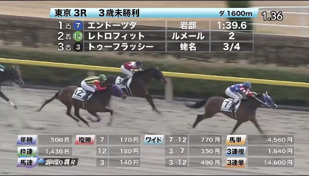 ◎エンドーツダ(2人気)1着 単勝500円、複勝170円