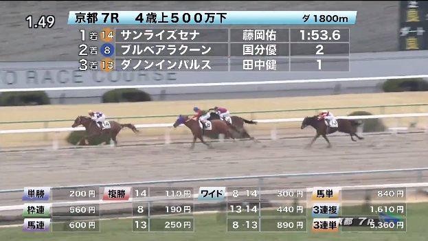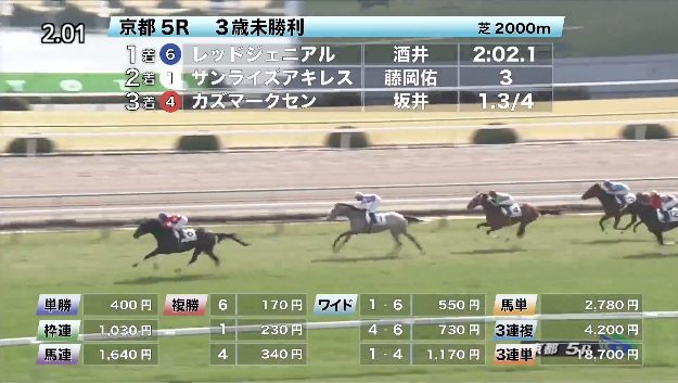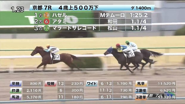 ◎ハクユウフライヤー(6人気)1着 単勝1,480円、複勝320円 - 2/3【京都4R】500万下