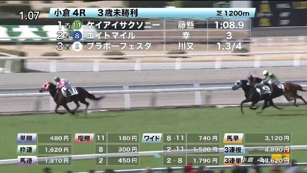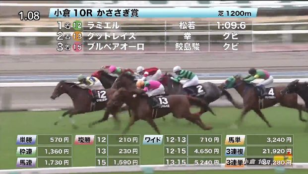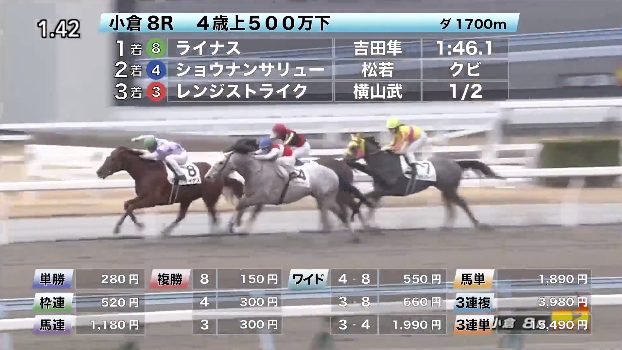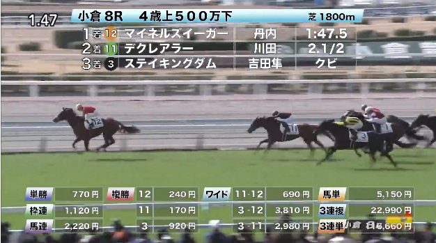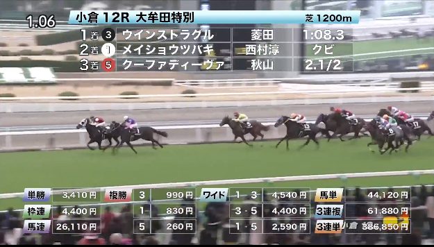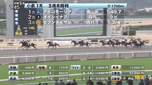 ◎ダンビュライト(6人気)1着 単勝850円、複勝220円 - 2/10【小倉3R】3歳未勝利
