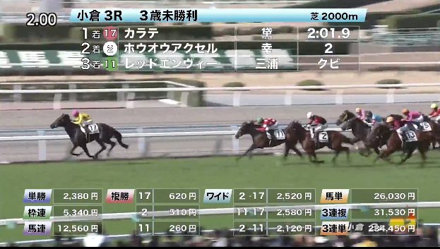 ◎カラテ(6人気)1着 単勝2,380円、複勝620円 - 2/17【小倉4R】3歳未勝利