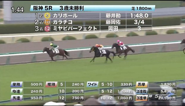 ◎グランプリワン(6人気)1着 単勝1,510円、複勝390円 - 3/3【阪神6R】3歳新馬