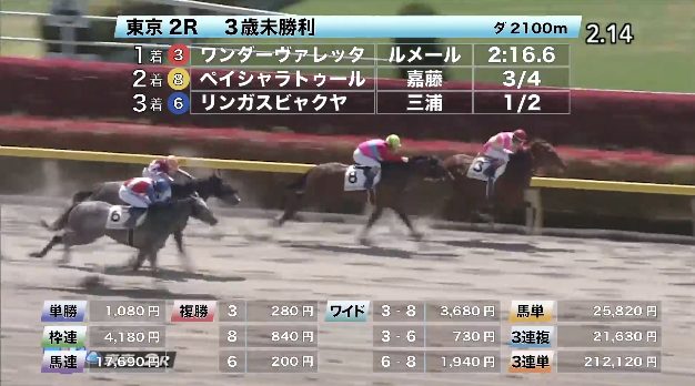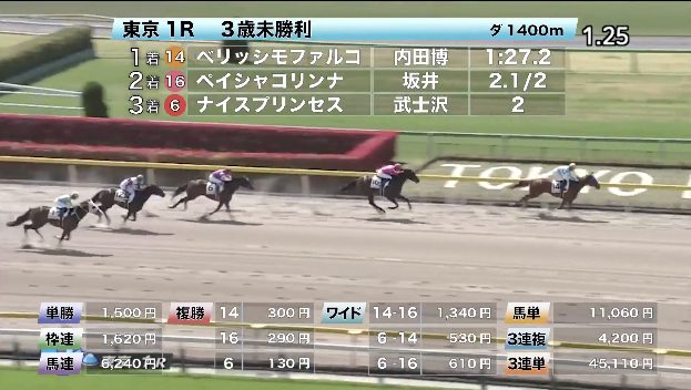 土曜の東京1Rでは1着に5番人気の穴馬本命◎ベリッシモファルコ、2着にも4番人気の穴馬本命◎ペイシャコリンナ、3着には相手馬★ナイスプリンセスが入りパーフェクト的中を推奨することができました。3連単では45,110円と配当的にも美味しい結果となりました。