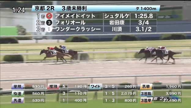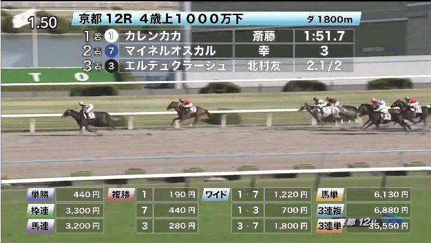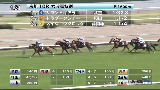 土曜の京都3Rでは1着に穴馬本命の9番人気◎ヒュミドール、2着に相手馬の★タカノアンジェラスが入りました。穴馬の単勝では4,750円、馬連では14,760円と万馬券をアシストすることができました。