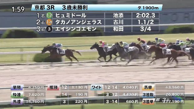◎ヒュミドール(9人気)1着 単勝4,750円、複勝1,130円 - 4/20【京都5R】3歳未勝利