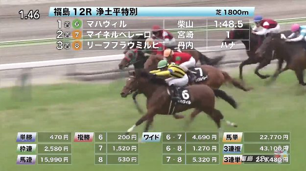 ◎マイネルヴァッサー(6人気)1着 単勝1,870円、複勝320円 - 4/6【福島12R】川俣特別