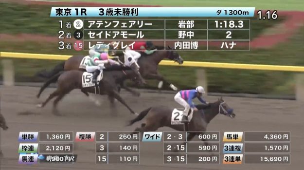 ◎アテンフェアリー(6人気)1着 単勝1,360円、複勝260円