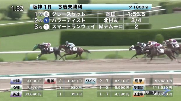 ◎マーベラスアゲン(6人気)3着 複勝320円 - 6/1【阪神1R】3歳未勝利