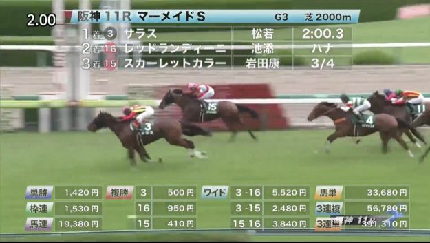 先週の阪神競馬は10Rの的中でした。マーメイドステークスでは◎サラスを推奨して1着に激走などこちらは先週と同様に好調な結果になりました。