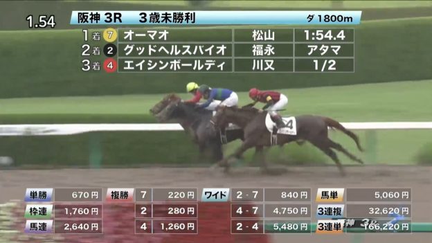 ◎マーベラスアゲン(6人気)3着 複勝320円 - 6/1【阪神1R】3歳未勝利