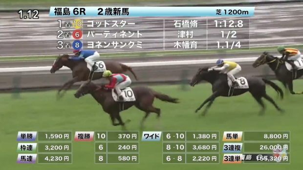 ◎ゴッドスター(6人気)1着 単勝1,590円、複勝370円 - 6/30【福島8R】3歳以上1勝クラス