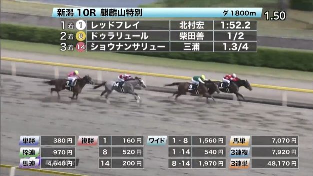 ◎ショウナンハルラ(10人気)1着 単勝2,980円、複勝590円 - 8/10【新潟7R】3歳以上1勝クラス