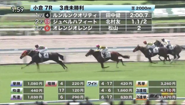 ◎ルンルンクオリティ(7人気)2着 複勝450円 - 8/4【小倉8R】3歳以上1勝クラス
