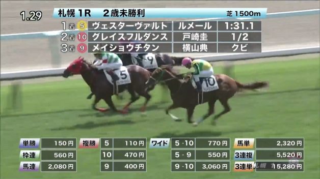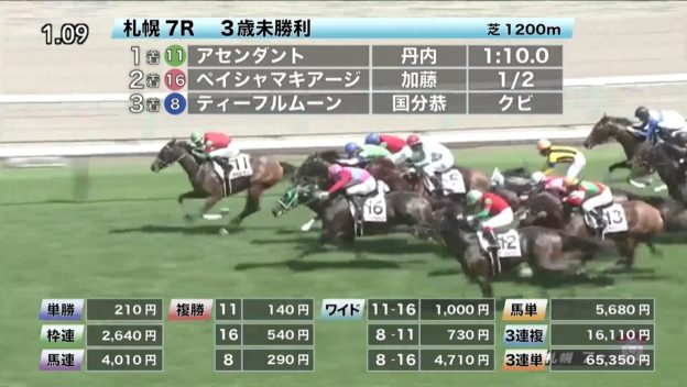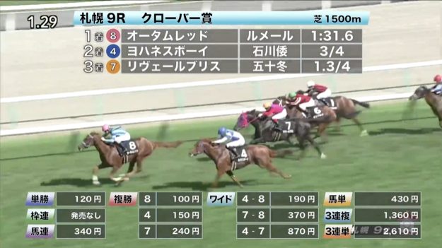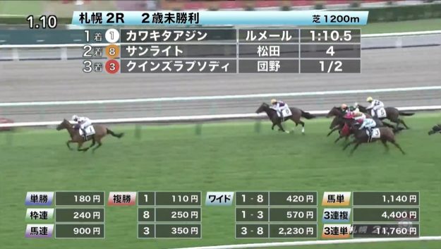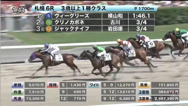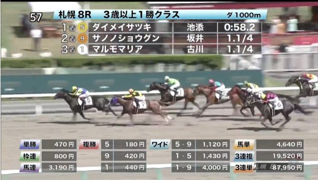 ◎ターフェルムジーク(8人気)1着 単勝2,860円、複勝400円 - 8/3【札幌10R】桑園特別