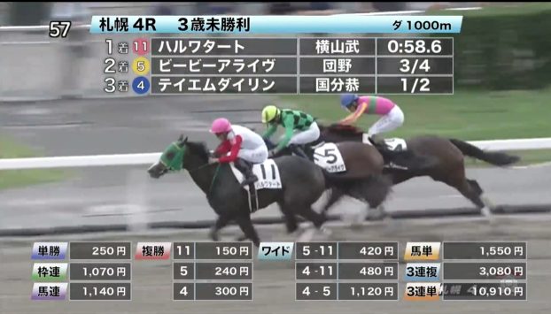 ◎ハルワタート(8人気)2着 複勝570円 - 8/4【札幌3R】3歳未勝利
