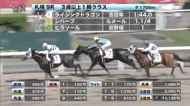 ◎ウィンドライジズ(6人気)1着 単勝1,450円、複勝380円 - 8/11【札幌7R】3歳以上1勝クラス