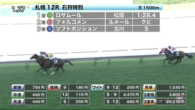 ◎レノカズマ(7人気)1着 単勝1,300円、複勝500円 - 8/10【札幌12R】知床特別