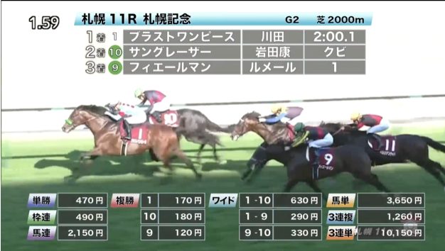 札幌競馬は土日で16Rの的中でした。土日を通じて的中数も断トツで文句のない結果となりました。札幌記念は◎サングレーザーを推奨してしっかりと的中に繋げることができました。この調子で好調の札幌は次週も好成績を維持していきたいです。