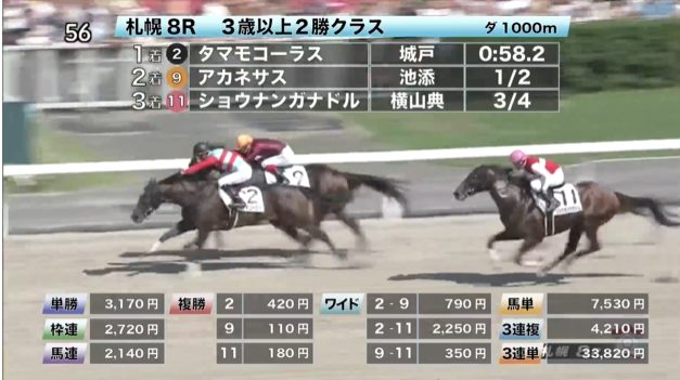 ◎タマモコーラス(7人気)1着 単勝3,170円、複勝420円 - 8/18【札幌9R】クローバー賞
