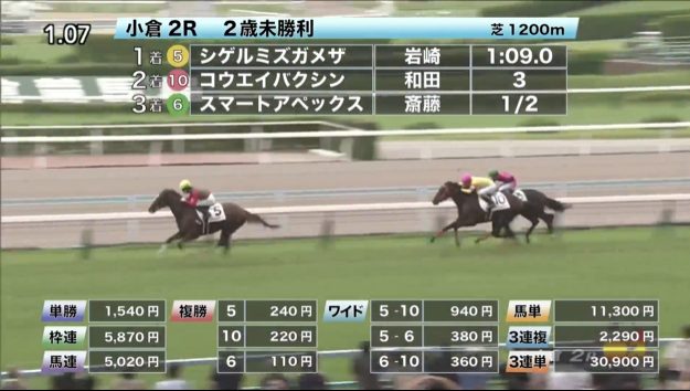 ◎シゲルミズガメザ(5人気)1着 単勝1,540円、複勝240円 - 8/25【小倉4R】3歳未勝利