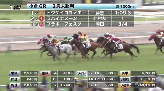 ◎トウケイココノエ(7人気)1着 単勝2,570円、複勝410円 - 8/25【小倉7R】3歳以上1勝クラス