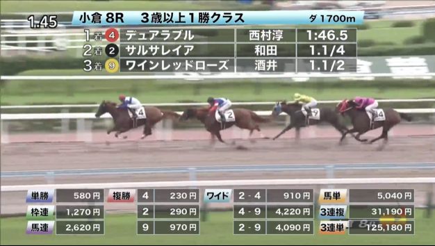 ◎サルサレイア(6人気)2着 複勝290円 - 8/25【小倉10R】別府特別