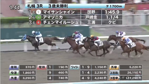◎タマモコーラス(7人気)1着 単勝3,170円、複勝420円 - 8/18【札幌9R】クローバー賞