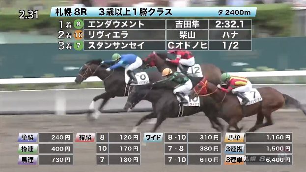 ◎トゥールナージュ(6人気)2着 複勝250円 - 8/10【札幌8R】3歳以上1勝クラス