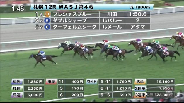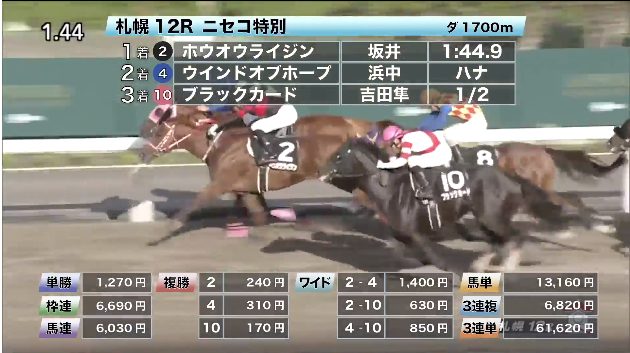 ◎ウィンドライジズ(6人気)1着 単勝1,450円、複勝380円 - 8/11【札幌7R】3歳以上1勝クラス
