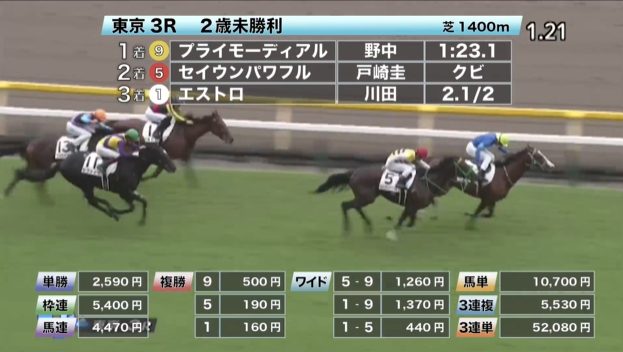 ◎プライモーディアル(6人気)1着 単勝2,590円、複勝500円