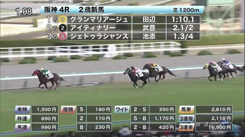 ◎グランマリアージュ(4人気)1着 単勝1,300円、複勝180円 - 12/8【阪神5R】2歳新馬