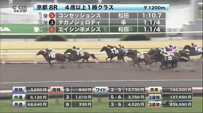 ◎コンセッションズ(11人気)1着 単勝3,650円、複勝840円 - 2/22【京都10R】河原町ステークス