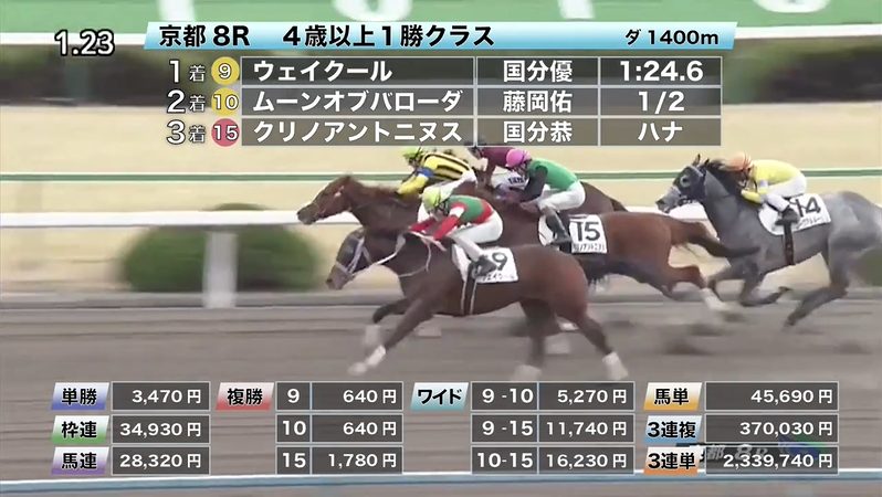 ◎ウェイクール(10人気)1着 単勝3,470円、複勝640円 - 2/23【京都9R】春日特別