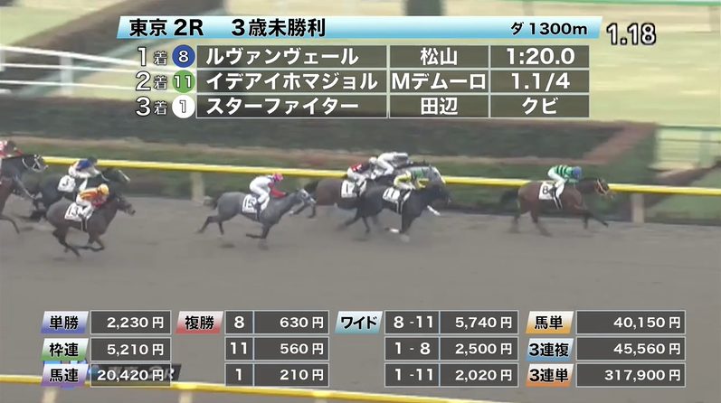 ◎ルヴァンヴェール(8人気)1着 単勝2,230円、複勝630円 - 2/16【東京4R】3歳新馬