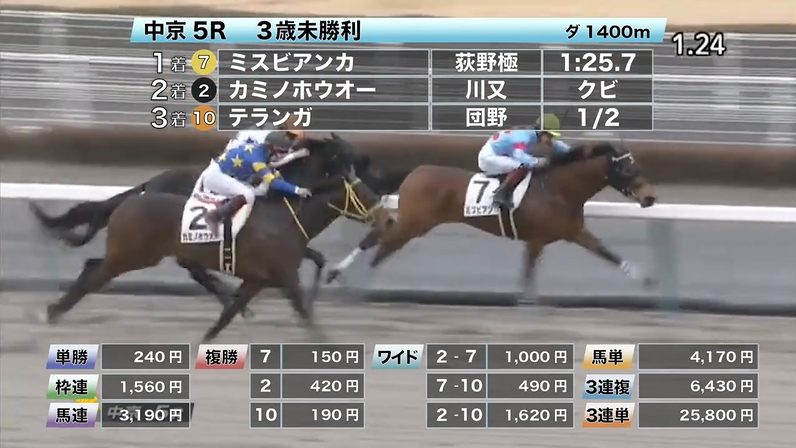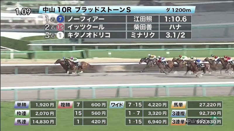 ◎ノーフィアー(7人気)1着 単勝1,920円、複勝600円
