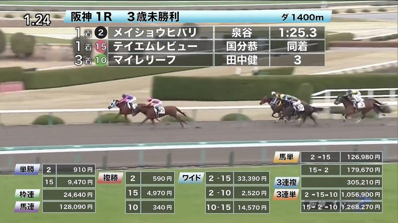 ◎メイショウヒバリ(6人気)1着 単勝910円、複勝590円