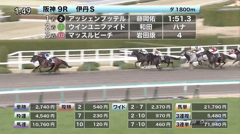 ◎アッシェンプッテル(6人気)1着 単勝2,740円、複勝540円