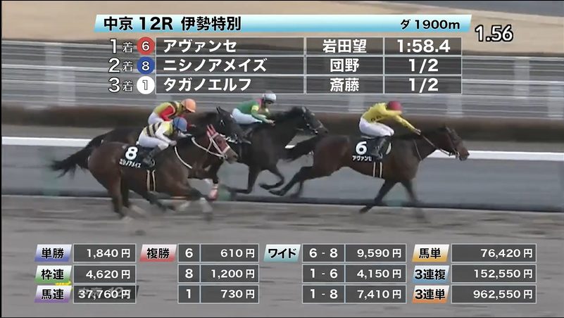 ◎アヴァンセ(6人気)1着 単勝1,840円、複勝610円