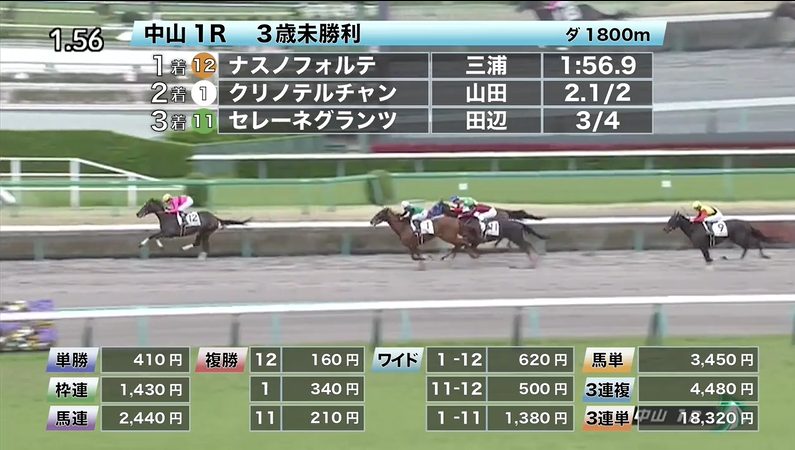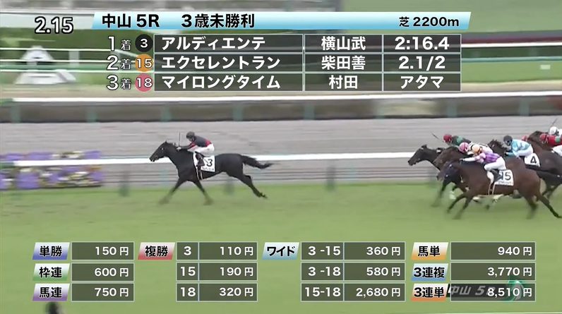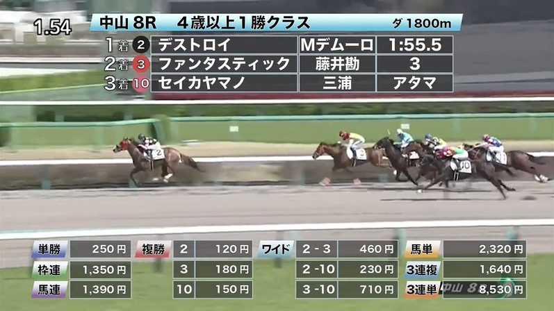 ◎シャチ(10人気)1着 単勝3,770円、複勝610円 - 4/4【中山8R】4歳以上1勝クラス