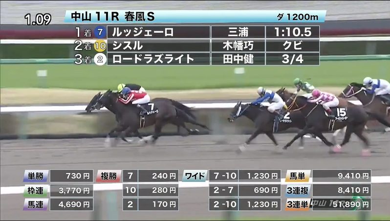 ◎マイロングタイム(6人気)3着 複勝320円 - 4/5【中山11R】春風ステークス